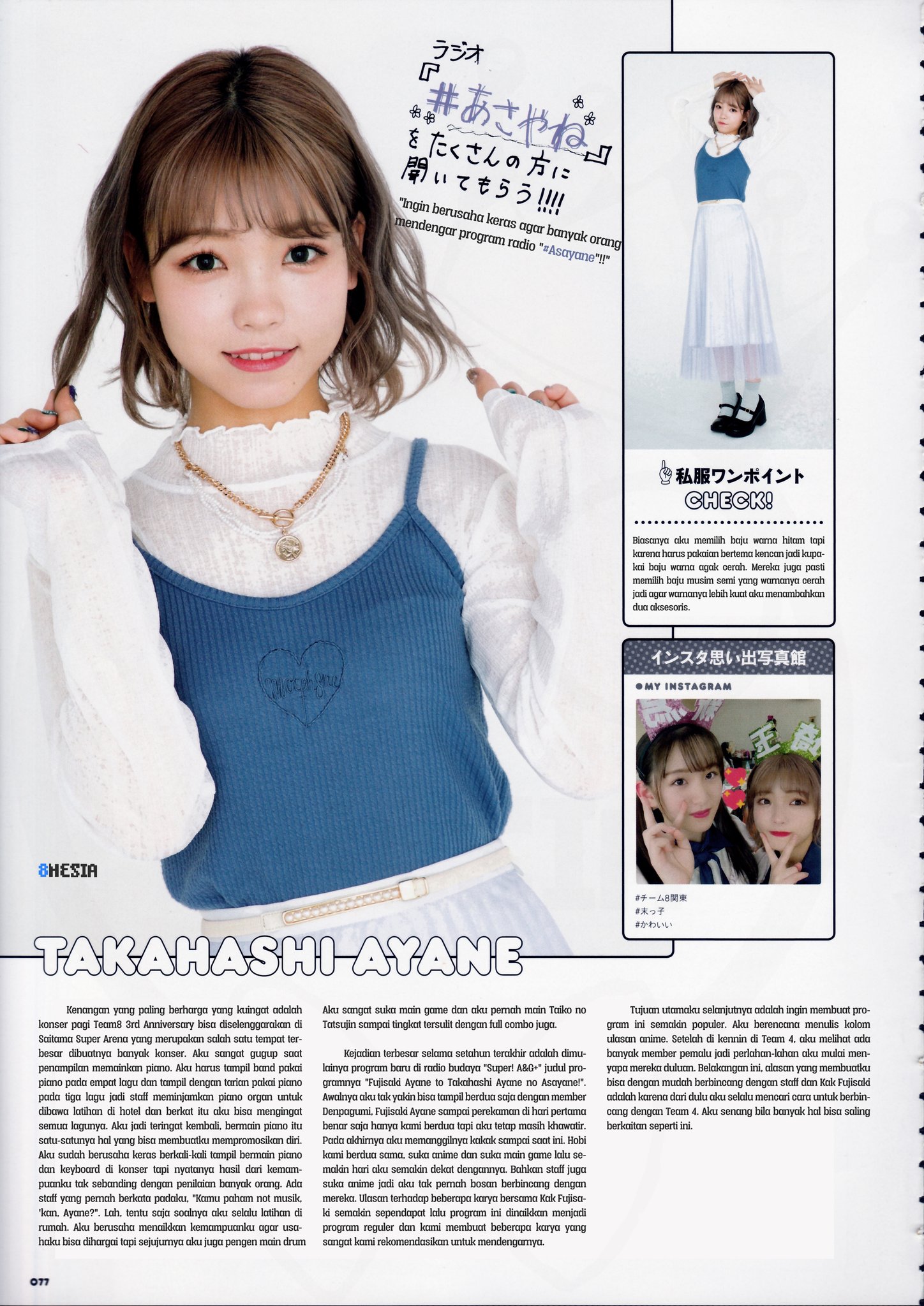 Kenangan yang paling berharga yang kuingat adalah konser pagi Team8 3rd Anniversary bisa diselenggarakan di Saitama Super Arena yang merupakan salah satu tempat terbesar dibuatnya banyak konser. Aku sangat gugup saat penampilan memainkan piano. Aku harus tampil band pakai piano pada empat lagu dan tampil dengan tarian pakai piano pada tiga lagu jadi staff meminjamkan piano organ untuk dibawa latihan di hotel dan berkat itu aku bisa mengingat semua lagunya. Aku jadi teringat kembali, bermain piano itu satu-satunya hal yang bisa membuatku mempromosikan diri. Aku sudah berusaha keras berkali-kali tampil bermain piano dan keyboard di konser tapi nyatanya hasil dari kemampuanku tak sebanding dengan penilaian banyak orang. Ada staff yang pernah berkata padaku, "Kamu paham not musik, 'kan, Ayane?". Lah, tentu saja soalnya aku selalu latihan di rumah. Aku berusaha menaikkan kemampuanku agar usahaku bisa dihargai tapi sejujurnya aku juga pengen main drum. Aku sangat suka main game dan aku pernah main Taiko no Tatsujin sampai tingkat tersulit dengan full combo juga.