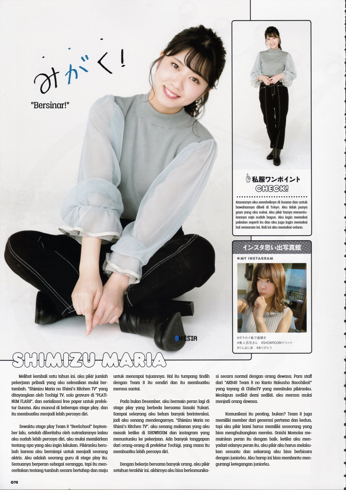 Melihat kembali satu tahun ini, aku pikir jumlah pekerjaan pribadi yang aku selesaikan mulai bertambah. "Shimizu Maria no Shimi's Kitchen TV" yang ditayangkan oleh Tochigi TV, solo gravure di "PLATINUM FLASH", dan serialisasi free paper untuk prefektur Gunma. Aku muncul di beberapa stage play, dan itu membuatku menjadi lebih percaya diri.